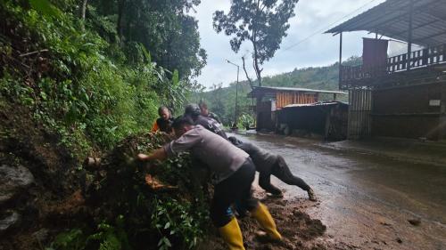 SEMPAT NUTUP JALAN, AKAR BAMBU AKIBAT LONGSOR DIBERSIHKAN POLSEK TRAWAS MOJOKERTO