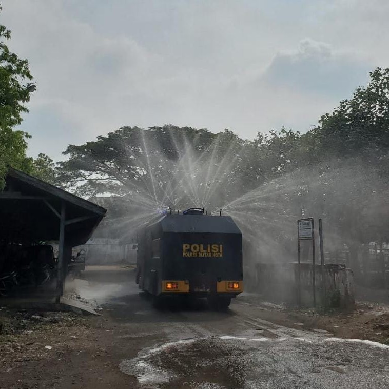 Gunakan Watercanon,Polres Blitar Kota Semprotkan Disinfektan di Pasar Dimoro