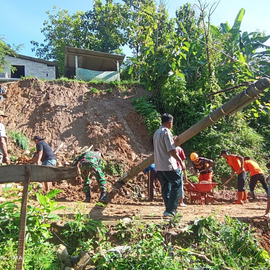Sinergitas Polisi Bersama TNI Bersihkan Tanah Longsor yang Timpa Rumah Warga di Trenggalek